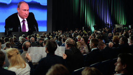 Президент России Владимир Путин проводит 18 декабря большую ежегодную пресс-конференцию. В этот раз традиционное общение с журналистами проходит на фоне резкого осложнения финансово-экономических проблем в стране. Это сформировало и чрезвычайно высокие ожидания от встречи президента с прессой. Регламента встречи не существует. Пресс-конференция Владимира Путина в Москве проходит в Центре международной торговли. На мероприятие в этот раз аккредитованы 1259 журналистов российских и зарубежных изданий, радиостанций и телеканалов.